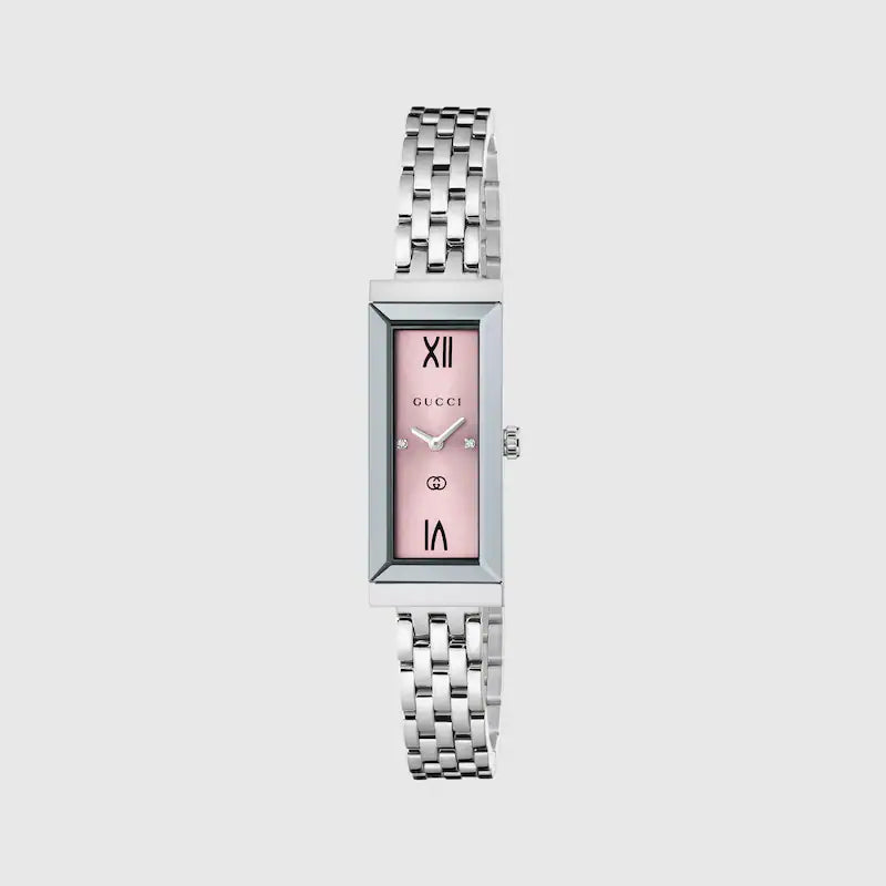 Defined by an elegant rectangular-shaped case, the G-Frame collection blends heritage details with a contemporary aesthetic. Crafted from a stainless steel case, the accessory is further enriched with a pink dial with diamonds.
