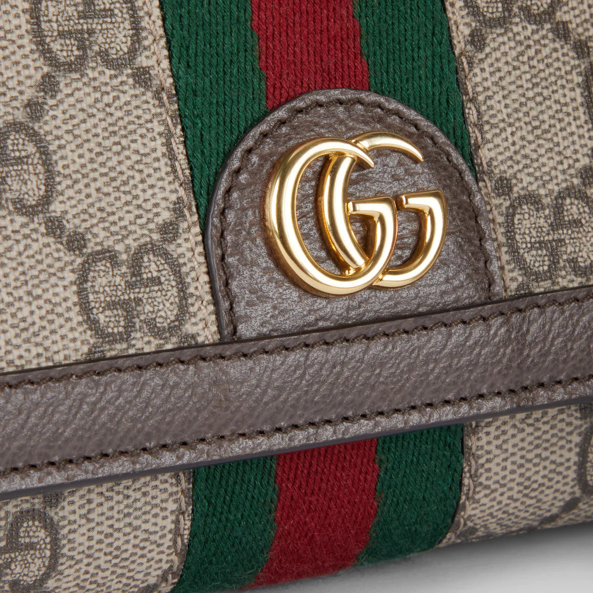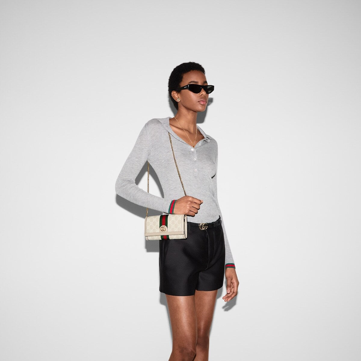 The world of Ophidia continues to evolve, incorporating new shapes and materials each season. Guccio Gucci's everlasting monogram continues to enrich new designs with a logo feel. This wallet on chain is presented in the classic beige and dark brown GG Supreme canvas, complete with a light gold-toned Double G hardware.
