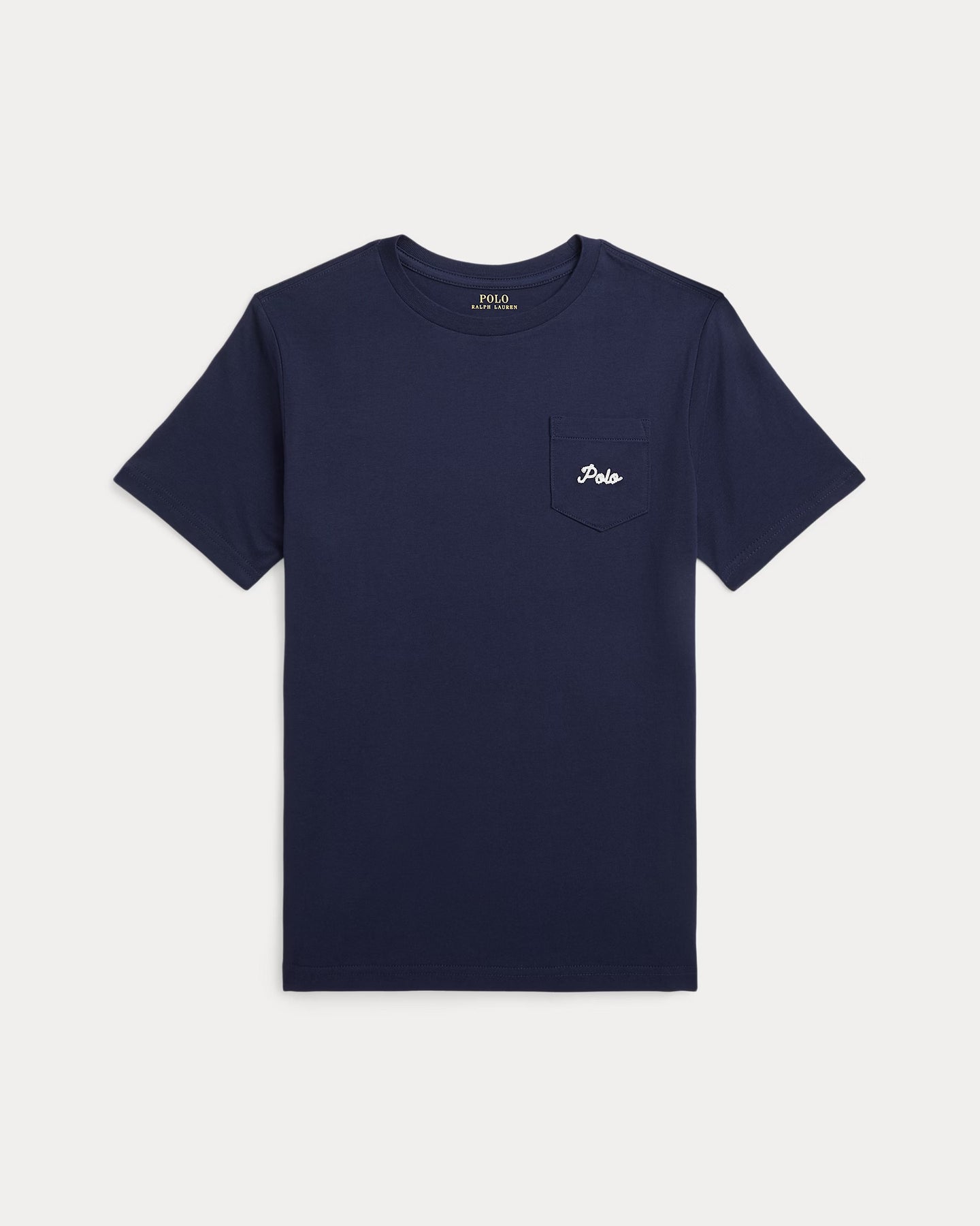 • Left chest patch pocket. Chain-stitched “Polo” embroidery at the pocket.