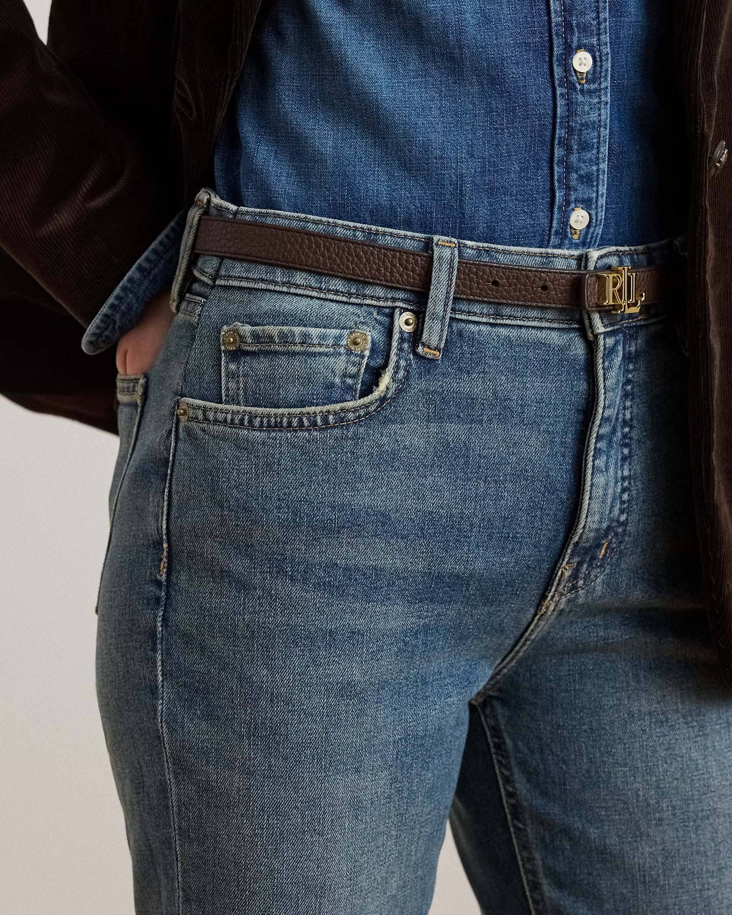 - Five-pocket styling with signature metal rivets. Debossed signature leather patch at the back right waist.