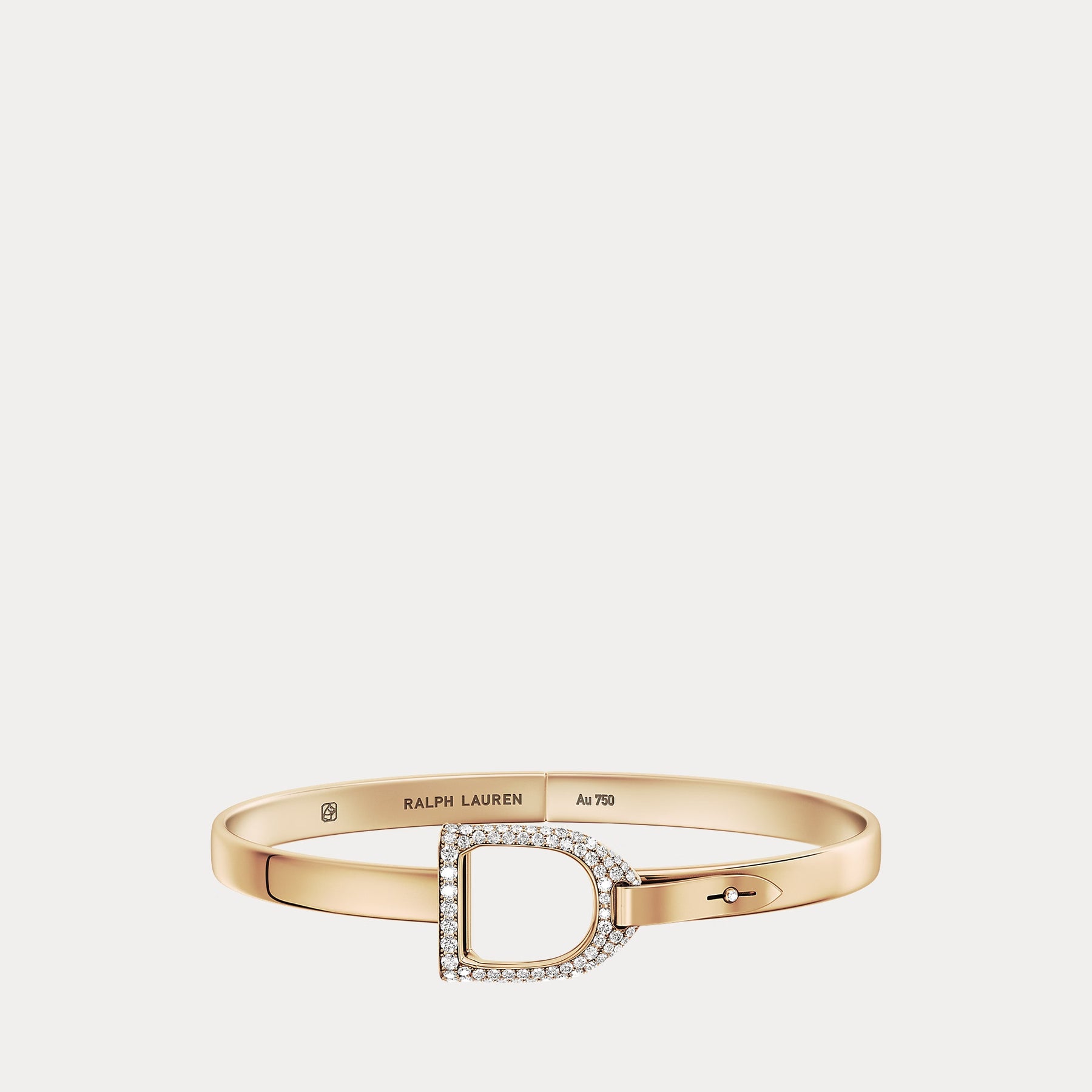 Realized in polished 18K rose gold, this elegant bangle embodies Ralph Lauren's affinity for the equestrian lifestyle with a stirrup at the center accented by a studded tab closure. Beautifully handcrafted by artisans in Italy, this piece is pavé-set at the stirrup with sparkling white diamonds, totaling approximately 0.38 carats.