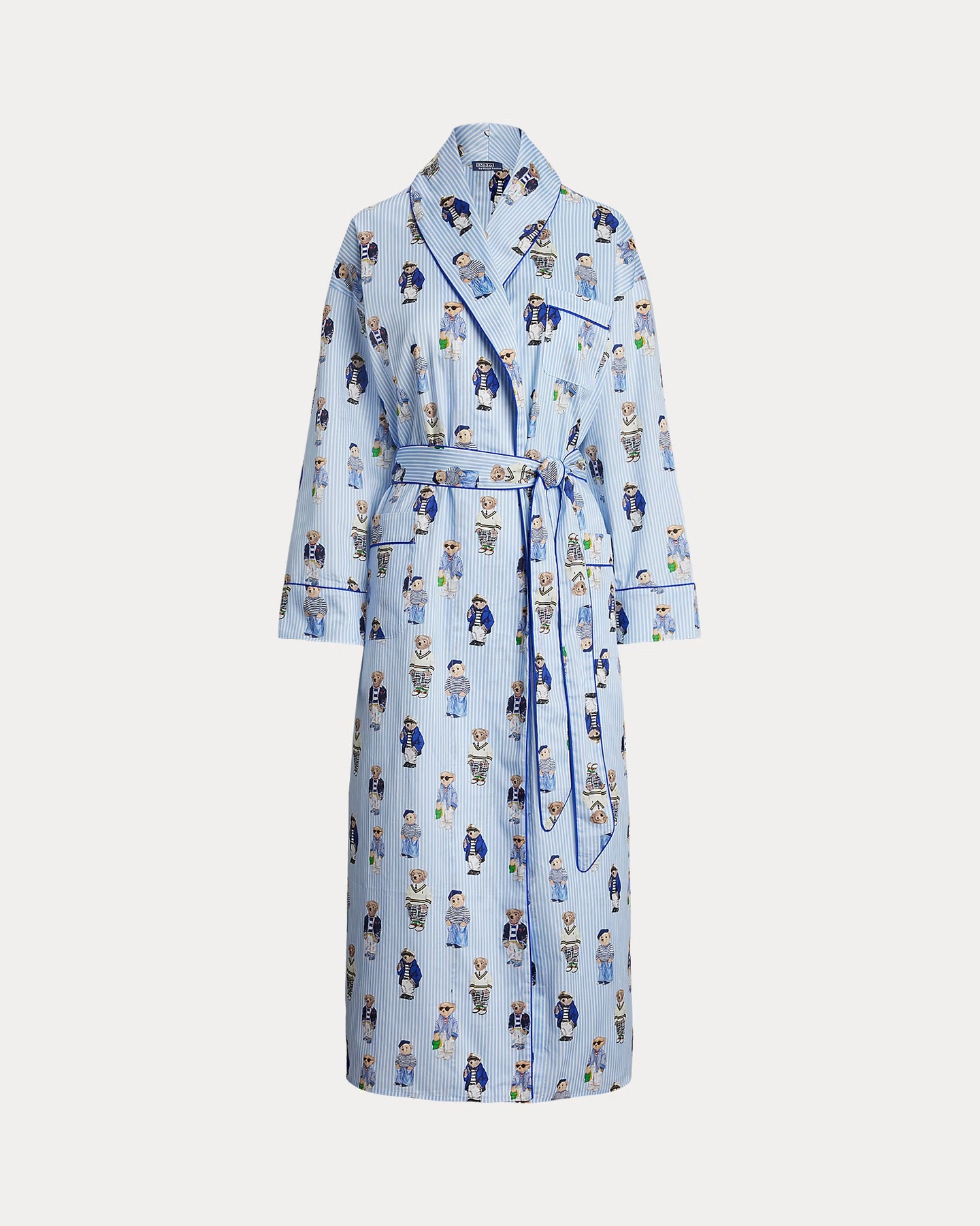 A playful motif featuring Ralph Lauren’s Polo Bear is printed across this striped robe, which is crafted with cotton sateen for a smooth hand and finished with classic piped trim.