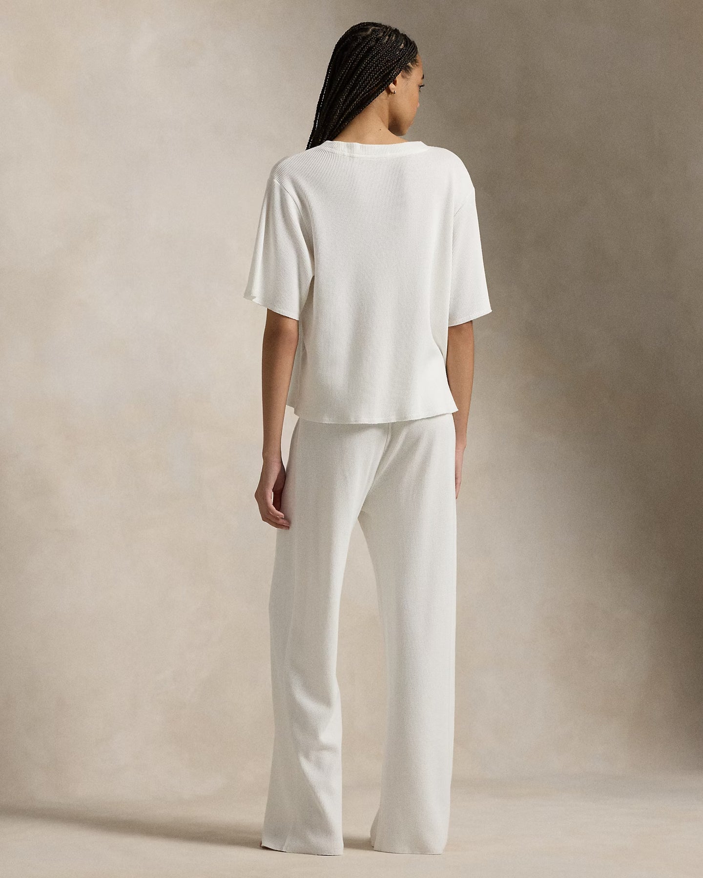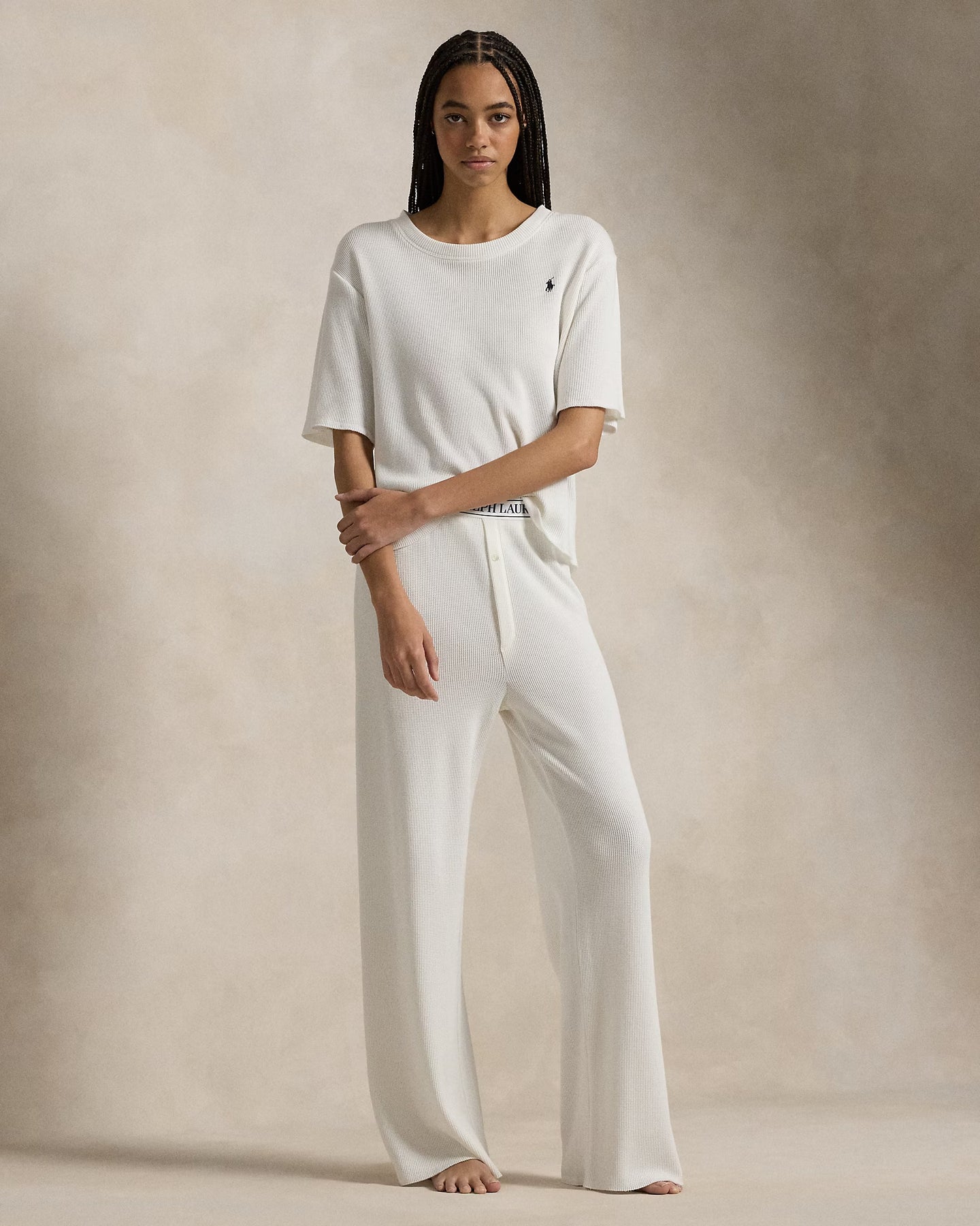 This waffle-knit pajama set is crafted with a stretch-cotton blend selected for its soft hand and breathability. Ralph Lauren’s signature embroidered Pony accents the left chest of the short-sleeve tee and the pants feature a “Polo Ralph Lauren” waistband.
