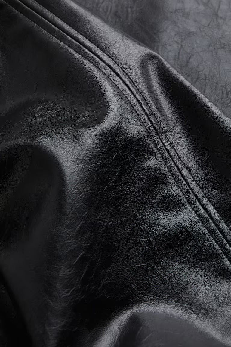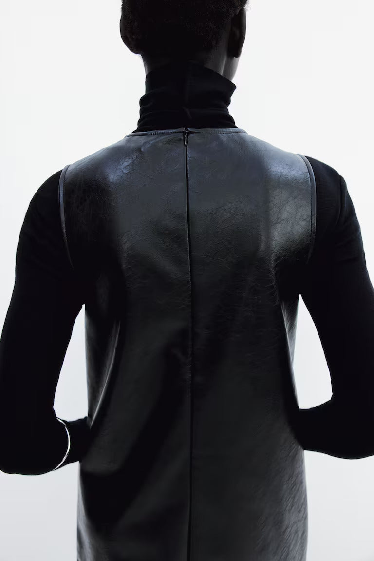 Short, sleeveless, A-line dress in coated fabric with visible seams at front. Round neckline at front, concealed zipper at back with hook-and-eye fastener, and decorative pocket flaps at front. Unlined.