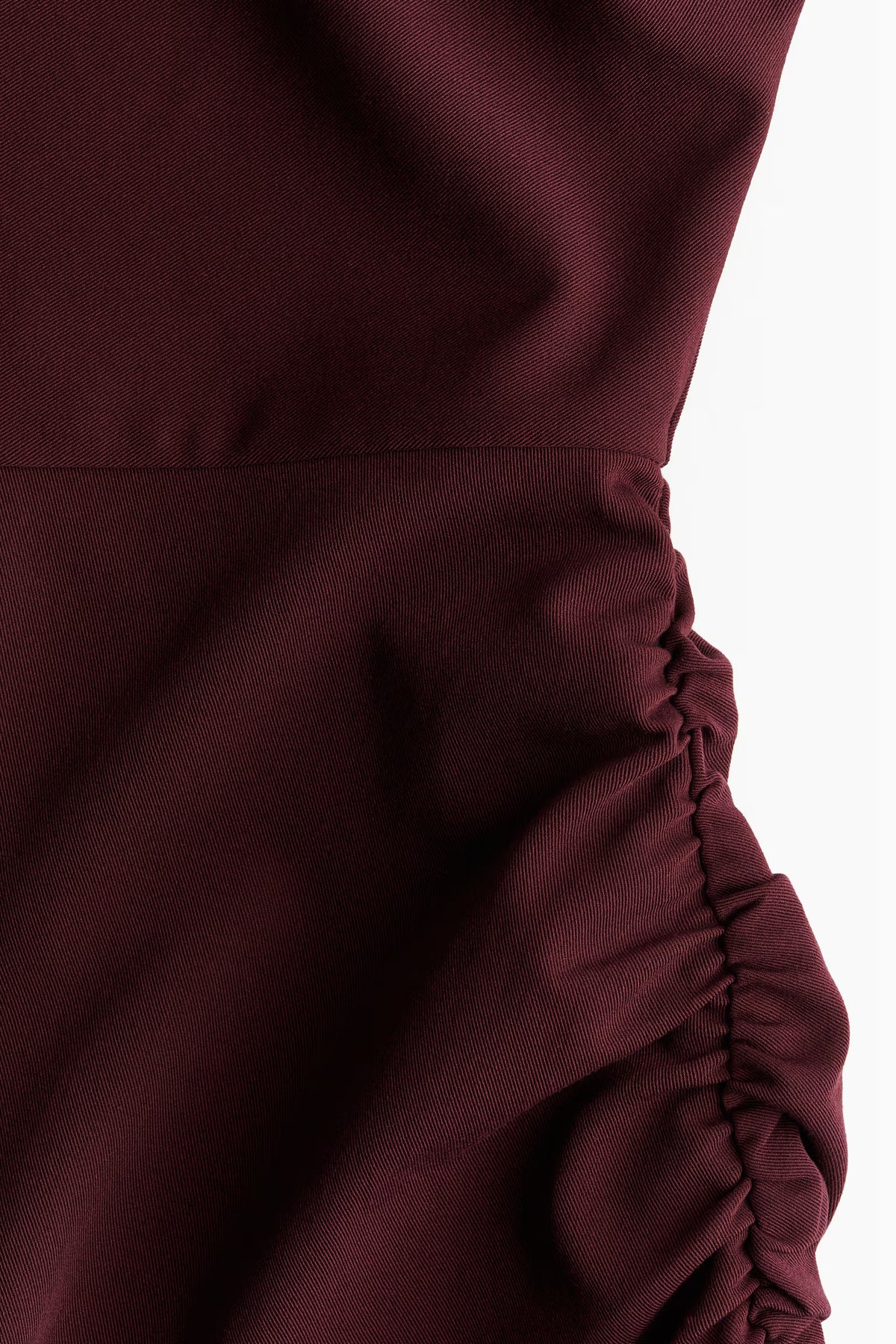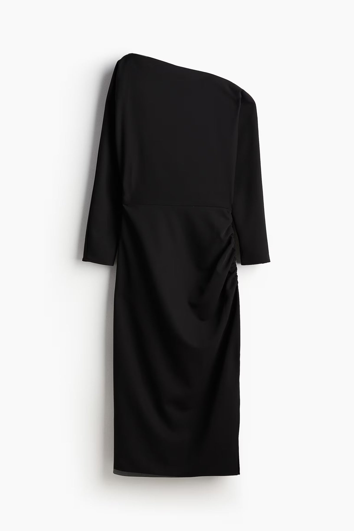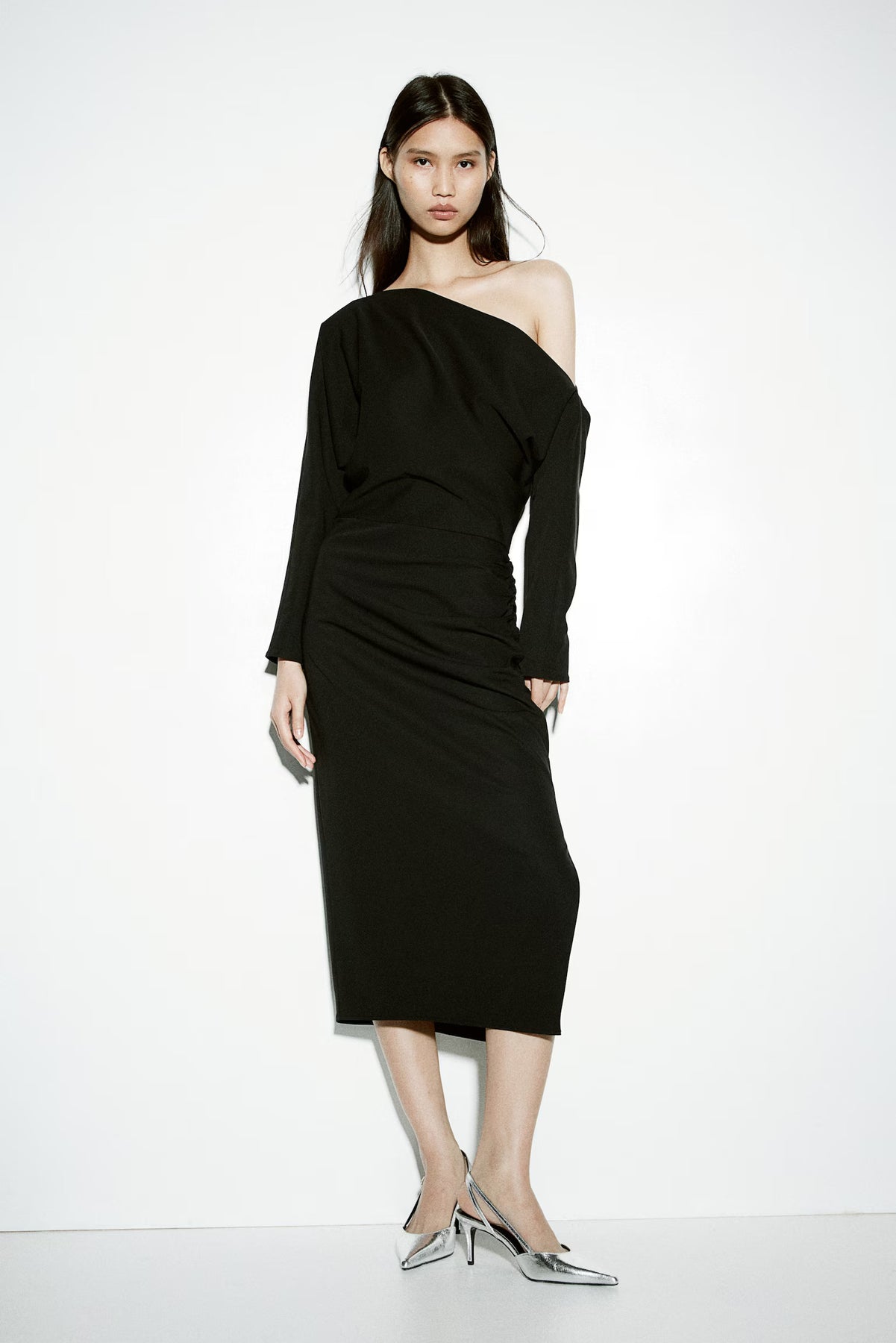 Calf-length dress in woven fabric. Asymmetric neckline, one open shoulder, and long, close-fitting sleeves. Fitted skirt with a concealed zipper at one side and gathers at other side for a draped effect. Straight-cut hem with slit at one side.