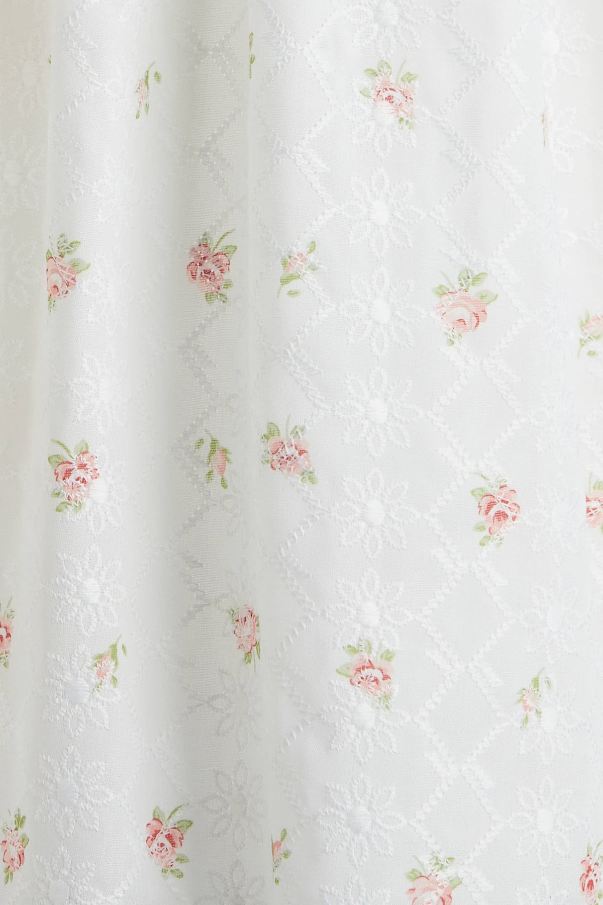 Short dress in woven fabric with an embroidered pattern and a fitted bodice. Round neckline, concealed zipper at one side, and an open back with narrow ties at back of neck. Elbow-length puff sleeves, gathered seam at waist, and gently flared skirt. Lined.