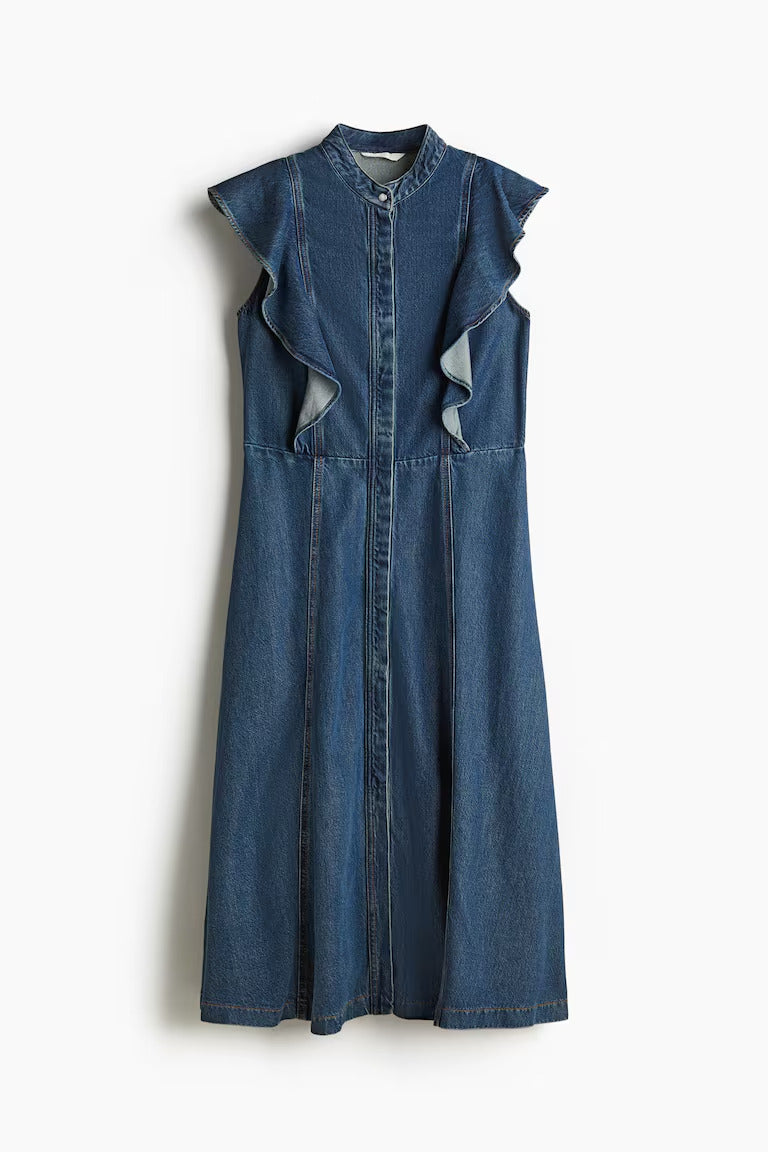 Fitted, sleeveless, calf-length dress in denim made from a lyocell and cotton blend. Band collar, concealed snap fasteners at front, and a gently flared skirt. Flounced trim extending from front of waist to shoulders, and downward to back of waist.