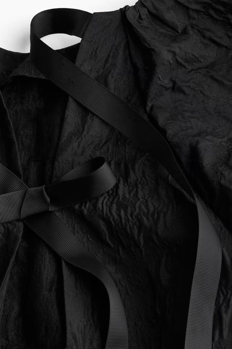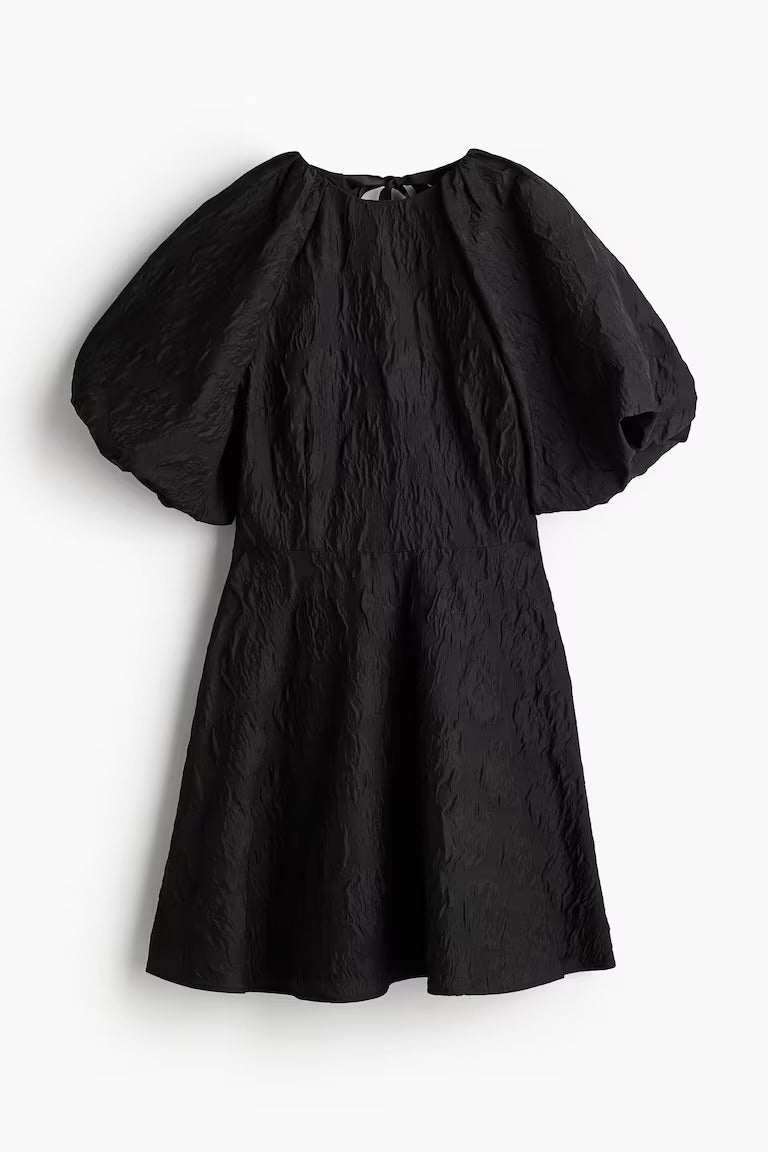 Short dress in jacquard-weave fabric. Round neckline, darts at bust, and an opening at back with two pairs of grosgrain-ribbon ties. Short, lined raglan balloon sleeves, a concealed zipper at one side, and a gently flared skirt.