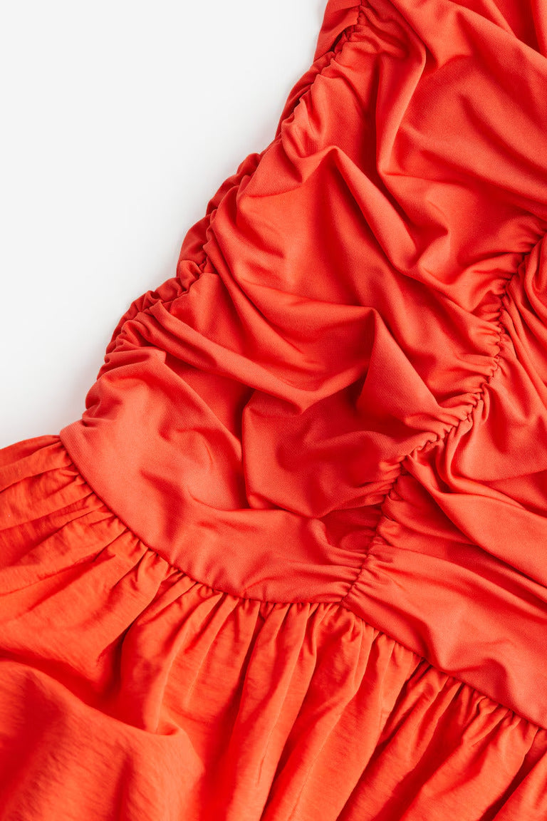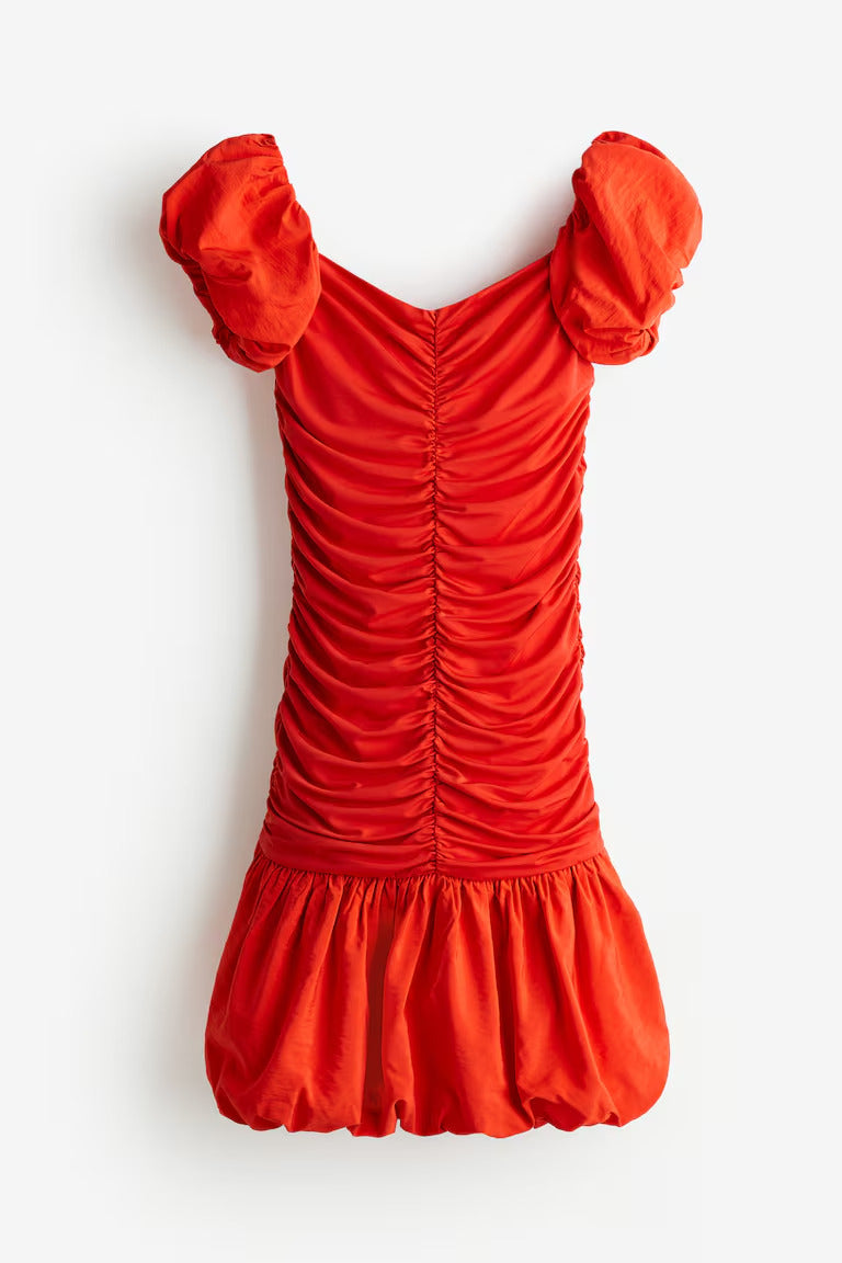 Short, fitted, off-the-shoulder dress in stretch jersey with short puff sleeves and a voluminous skirt, all in crisp, woven fabric. Gathered seams at front, back, and side seams for a ruched effect. Gathered seam below hips and a bubble hem for a puffy silhouette. Lined.