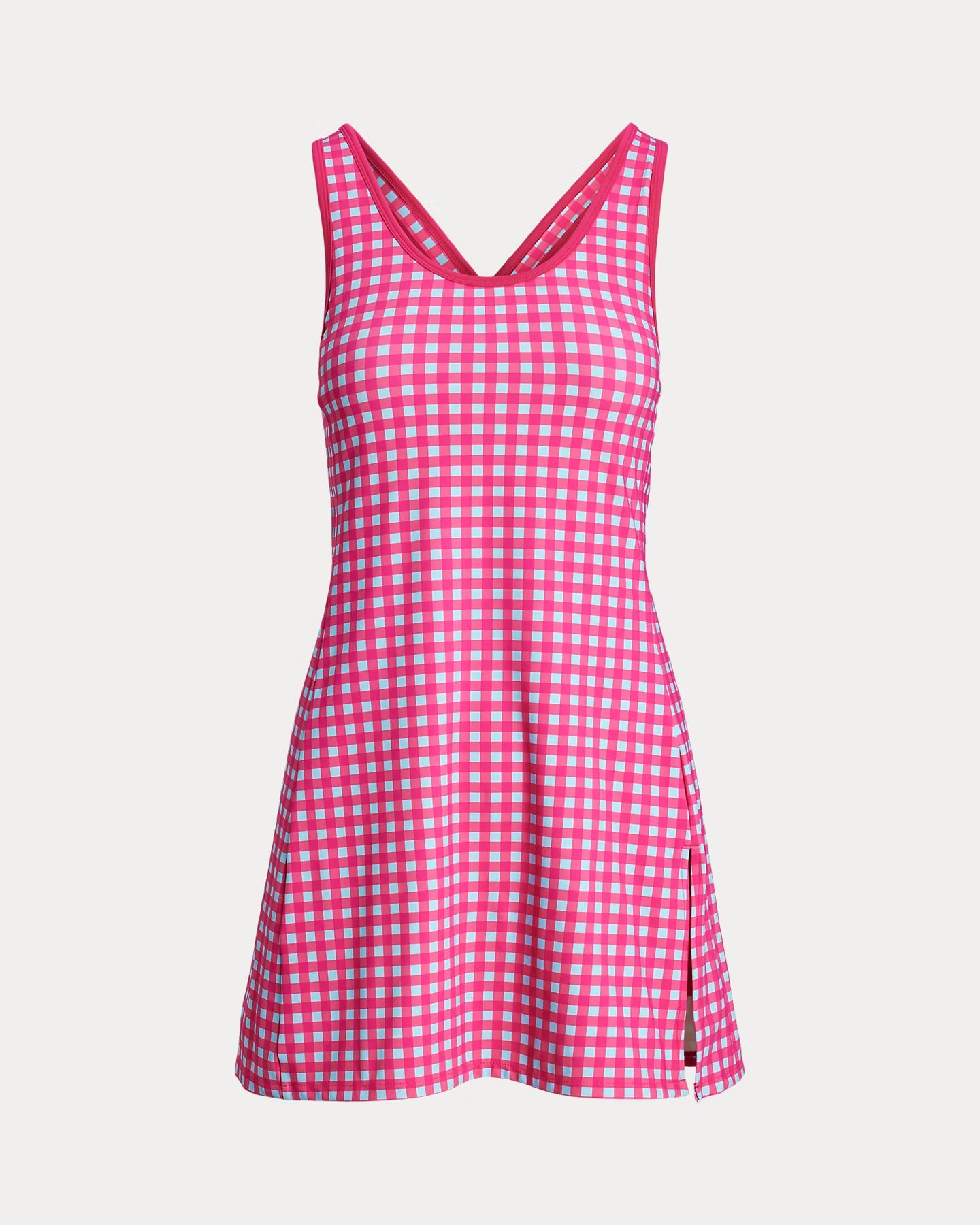 Crafted with stretch interlock for ease of movement, this gingham fit-and-flare dress features crisscross back strap
