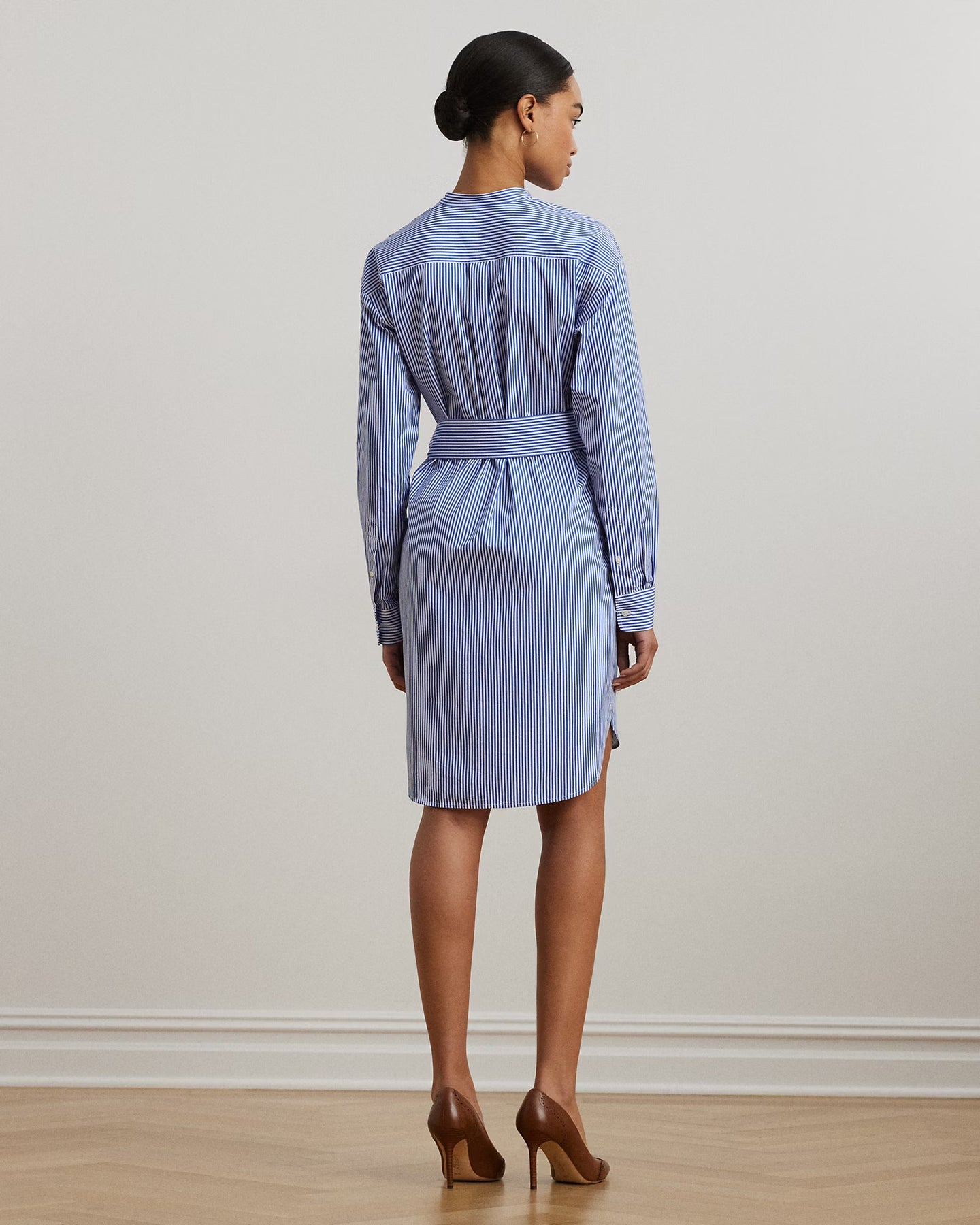 An enduring wardrobe staple, this cotton broadcloth shirtdress features a streamlined silhouette punctuated by slender, yarn-dyed stripes. A self-belt cinches the waist, while Lauren’s prominent embroidered monogram at the chest pocket adds signature style.