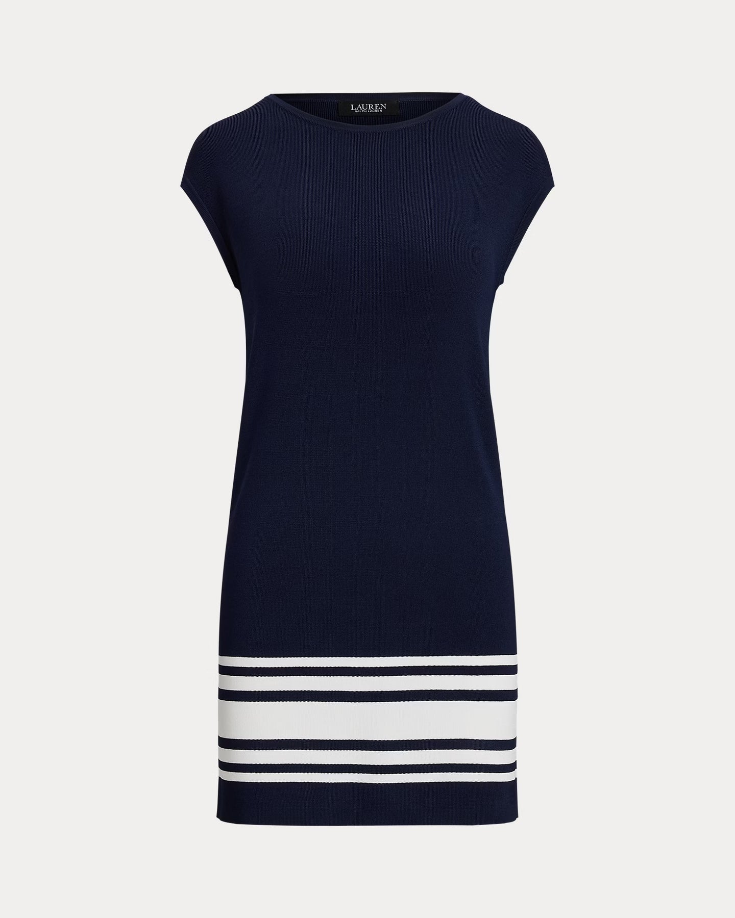 A navy-and-white two-tone design with a striped motif at the hem brings a nautical-inspired twist to this sweater dress, while cap sleeves and a breezy shift silhouette make it the perfect style for transitional dressing.