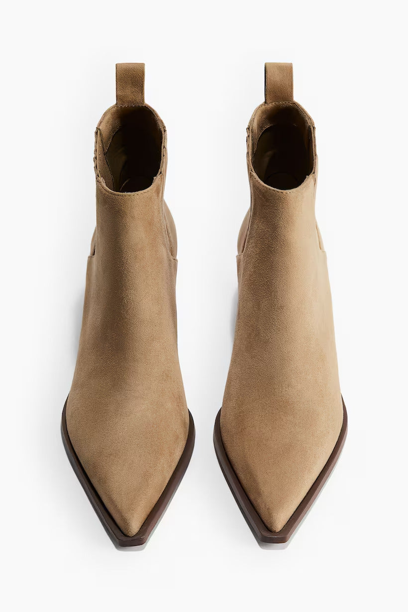 Ankle-high cowboy boots in napped fabric. Pointed toes, loop at opening, elasticized side panels, and slanted block heels. Satin lining and insoles. Heel height 2 1/4 in.