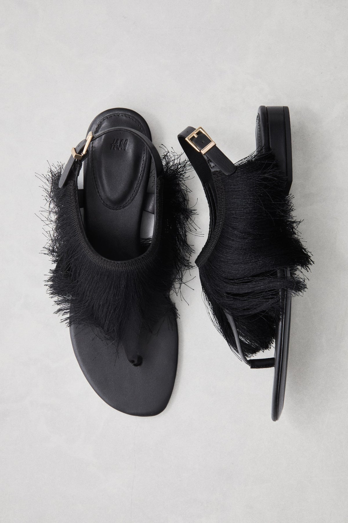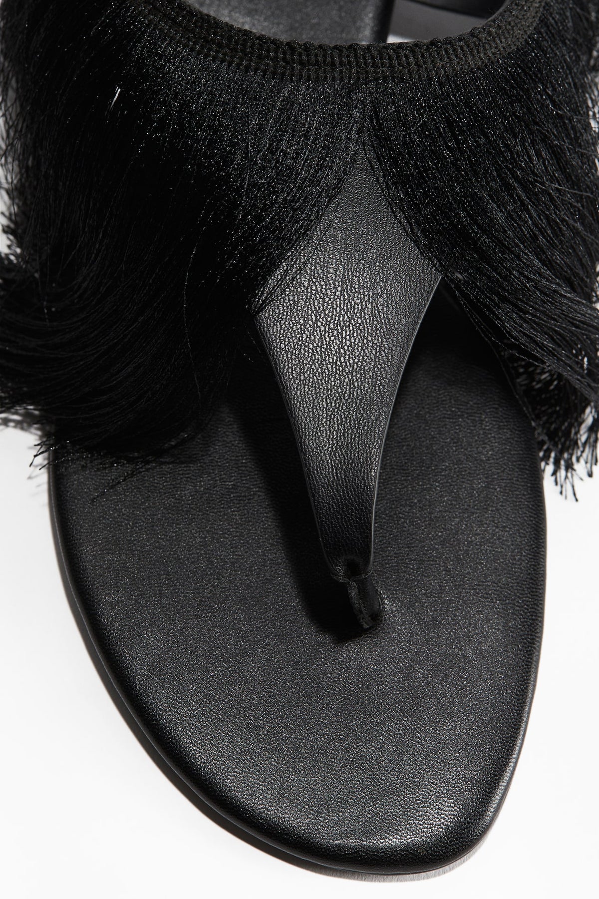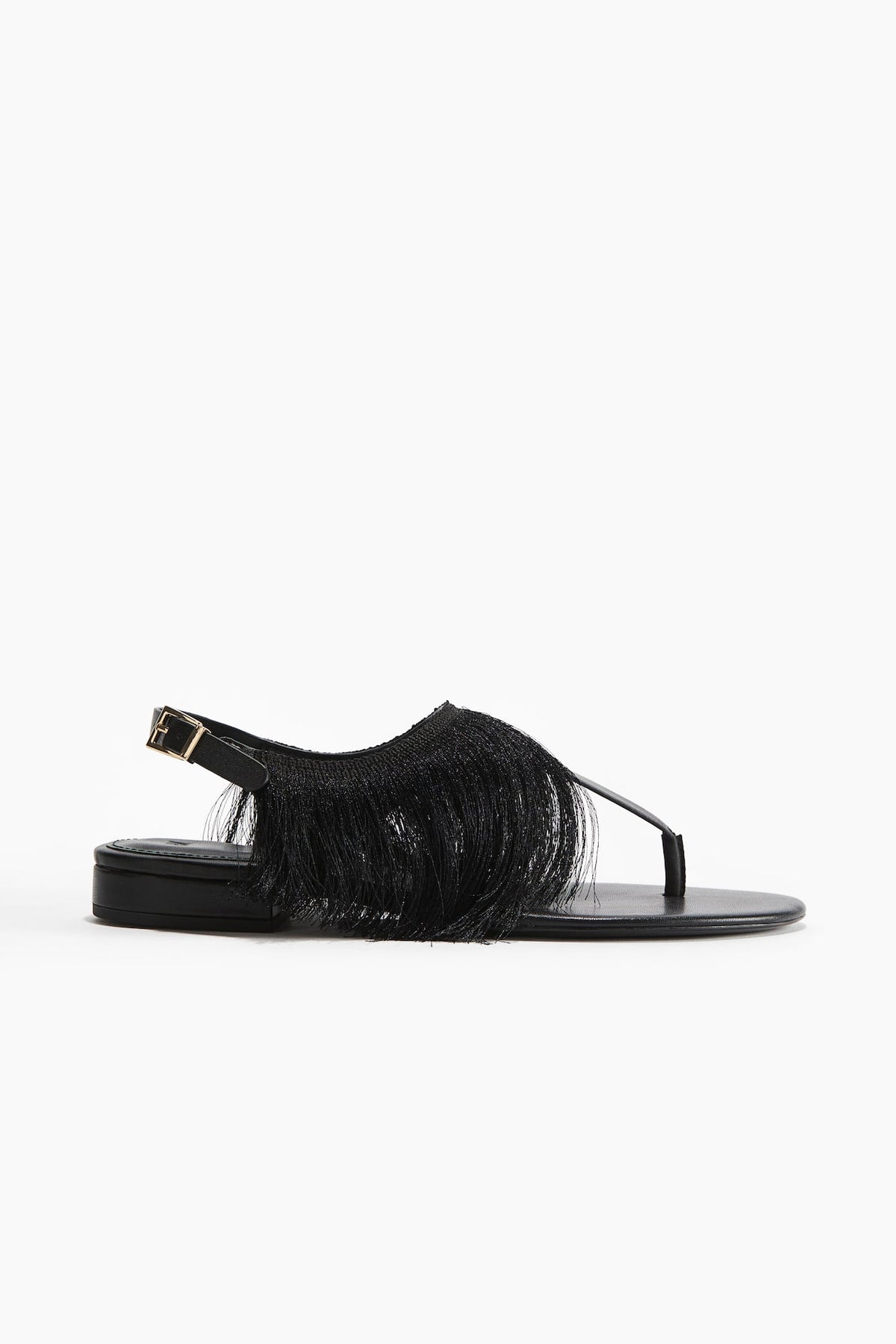 T-strap sandals in coated fabric. Rounded toes with a toe post, billowing fringe over foot, and a narrow, adjustable ankle strap with a square metal buckle.