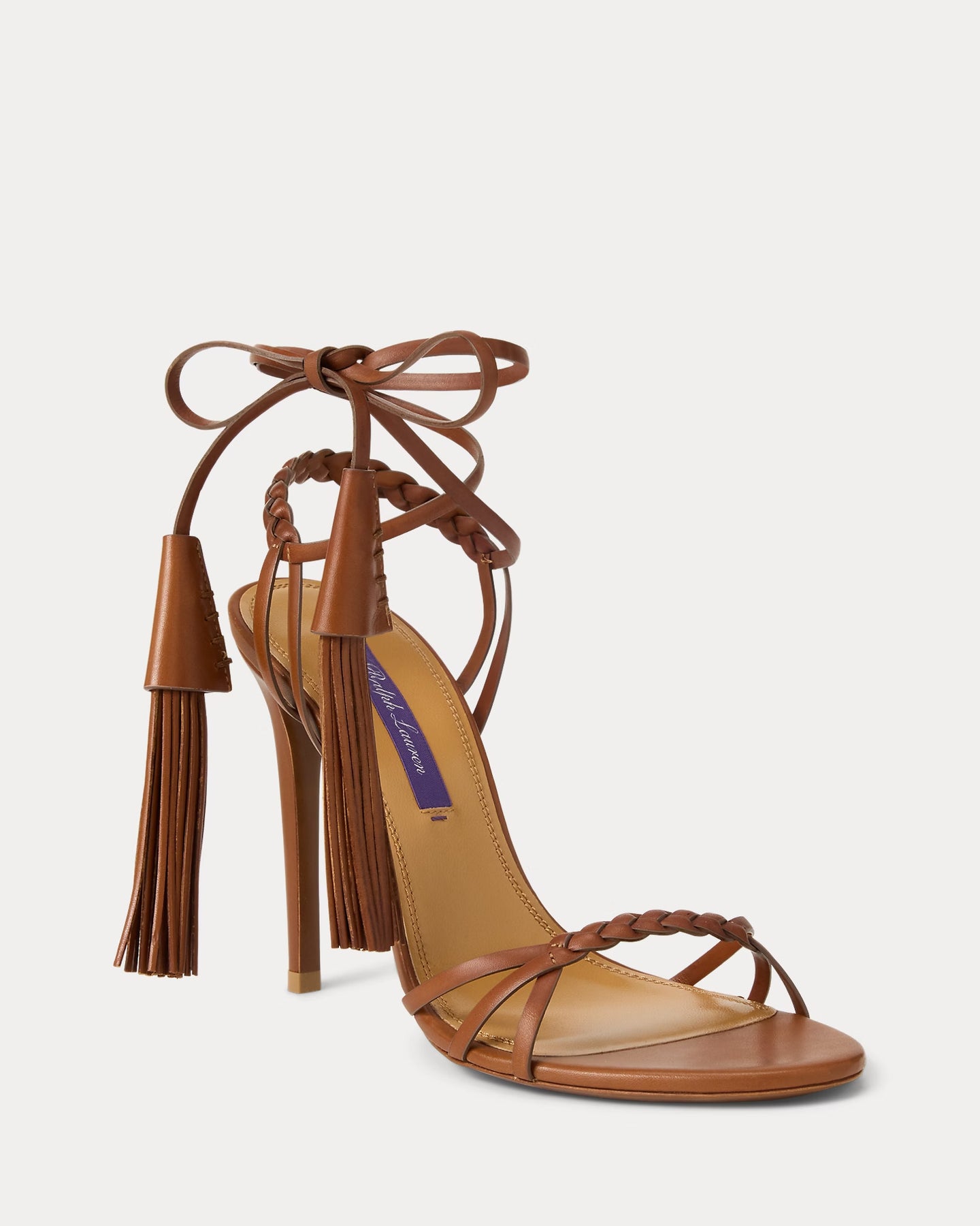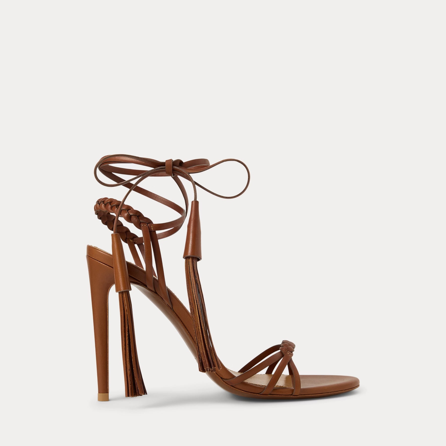 A masterpiece of Italian craftsmanship, the Alexandrea sandal is offered in two versatile heights: an alluring 100-mm for striking elegance and a graceful 35-mm for refined ease. Meticulously crafted with burnished full-grain calfskin specially selected for its sheen and rich dimensional hues, this 100-mm version features a contemporary lace-up design accented with hand-braided straps and tassels—a testament to Ralph Lauren’s timeless style and impeccable artistry.