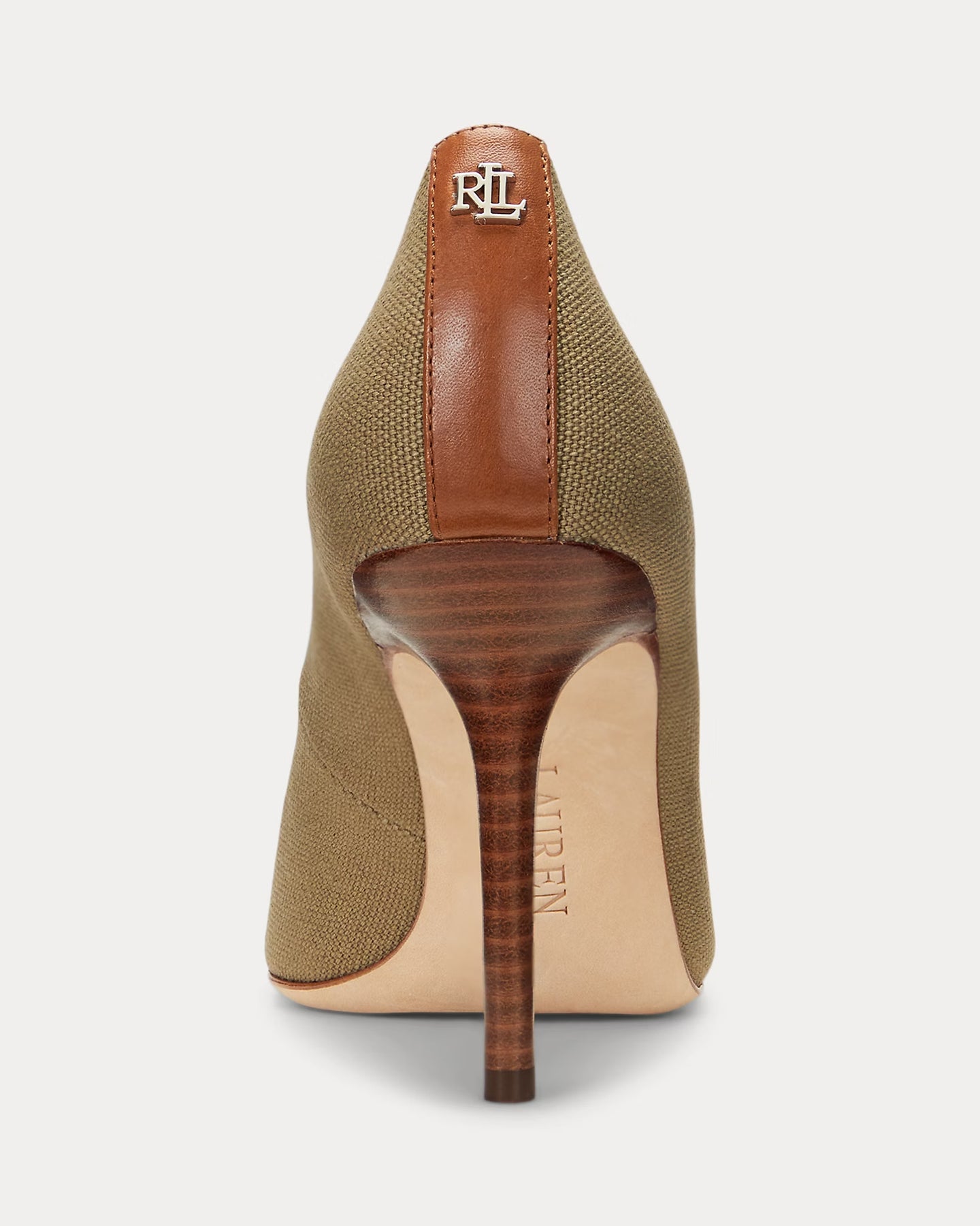 Featuring a smart, pointy-toe silhouette, this version of Lauren’s Lindella pump is crafted with piece-dyed canvas for subtle dimension. Sumptuous leather trim and a 90-mm stacked leather heel enhance its elegant appeal, while an “LRL” logo at the back counter adds signature style.