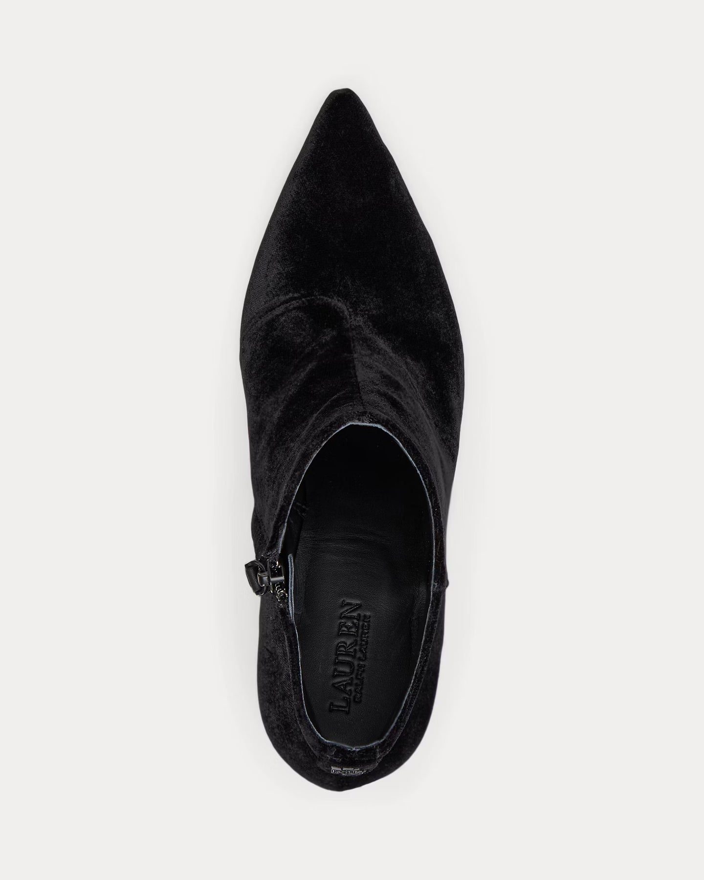 Defined by a sleek, pointy-toe silhouette and a slender 70-mm heel, this iteration of the Lizie bootie is realized in plush velvet for a beautiful sheen. A glamorous option for the holiday season, this style is finished with a tonal “LRL” metal logo at the back.