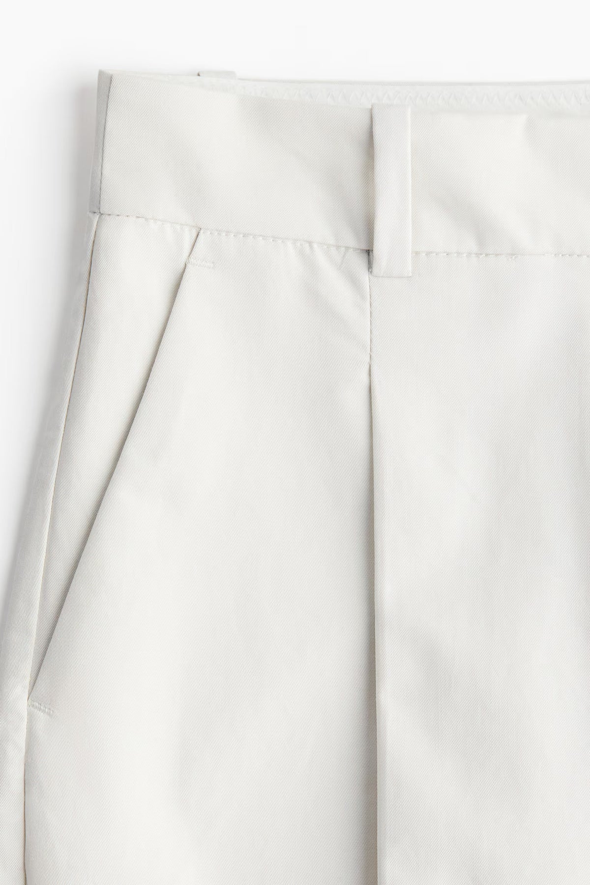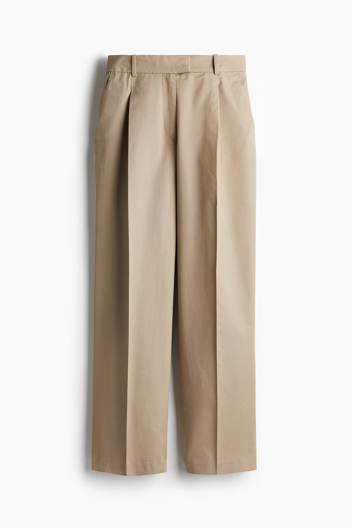 Loose-fit chinos in cotton twill with pleats at front. High waist, extended waistband tab with concealed button and hook-and-eye fasteners, and a zip fly. Diagonal side pockets, welt back pockets, and straight legs with creases at front and back.