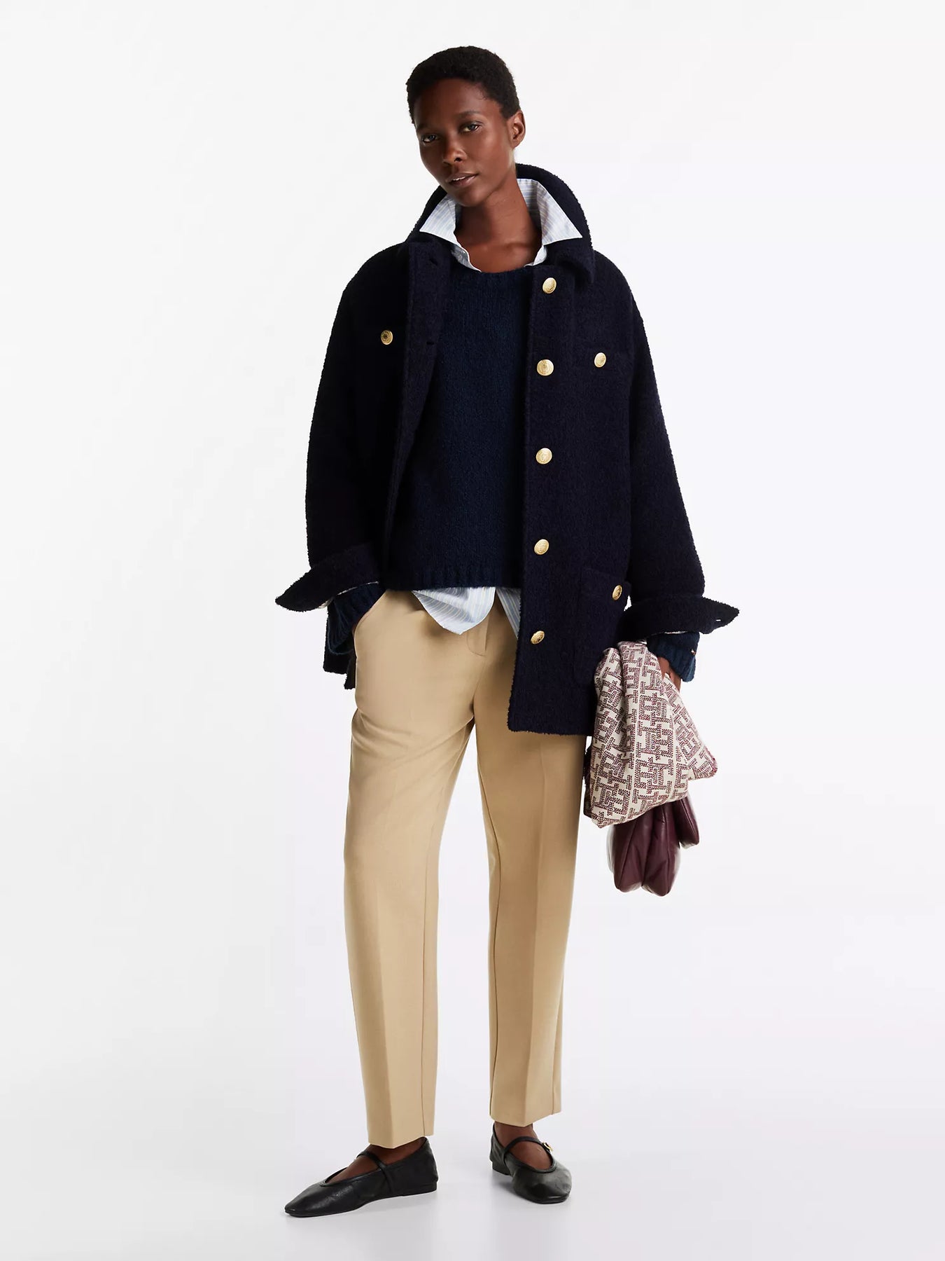 ommy Hilfiger women's pant. Our pants are made from a smooth, double-knit weave with plenty of stretch. Designed with a slim, straight-leg, they pair easily with a blazer at the office or your favorite white cotton tee.