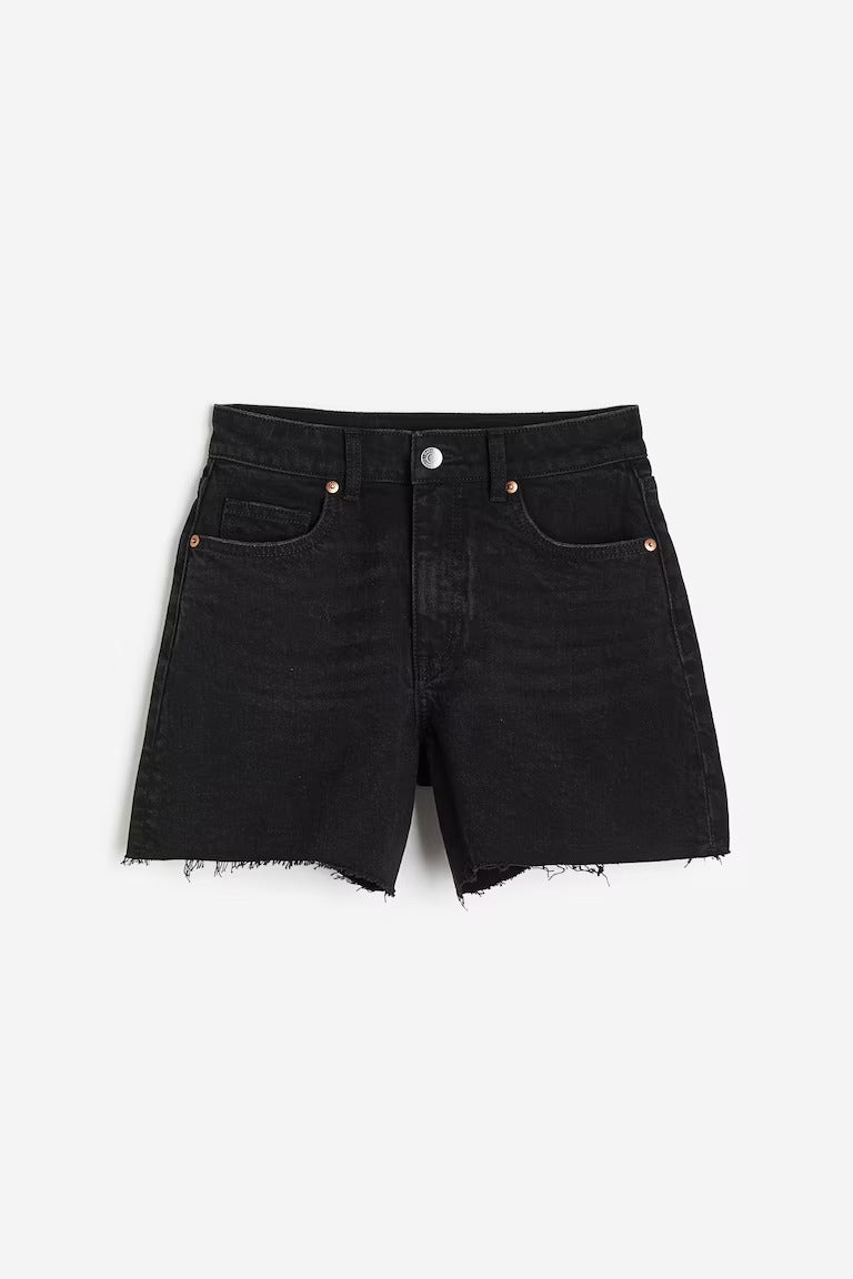5-pocket shorts in denim with gentle stretch. High waist, zip fly with button, and raw-edge hems.