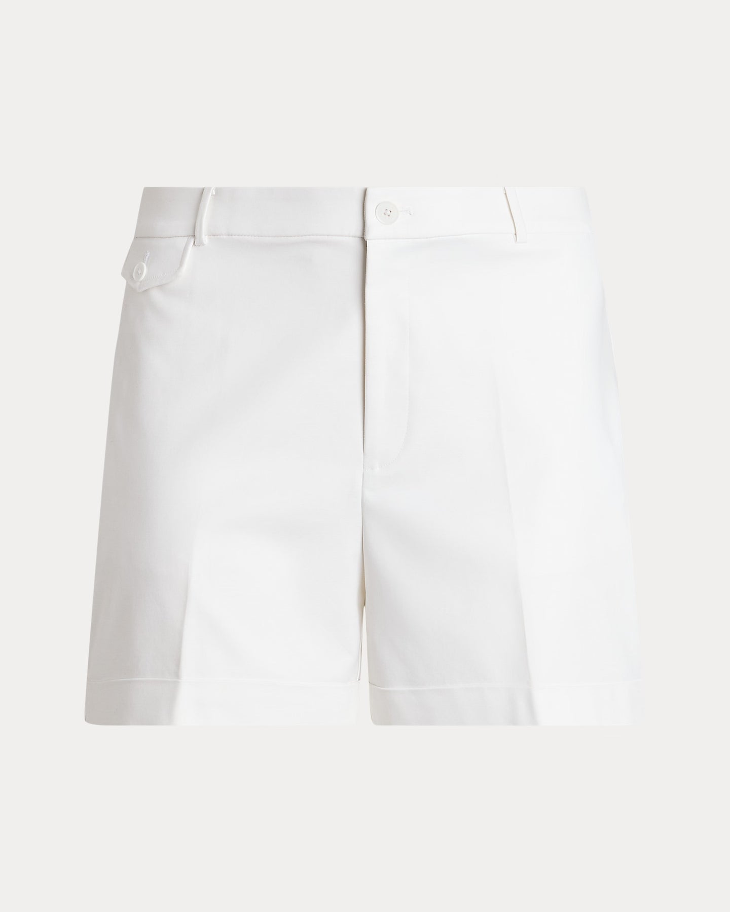 Crafted with double-faced stretch cotton, these high-rise shorts are detailed with crisp pleats, folded cuffs, and waist darts for a polished look. Signature horn-effect buttons provide added sophistication.