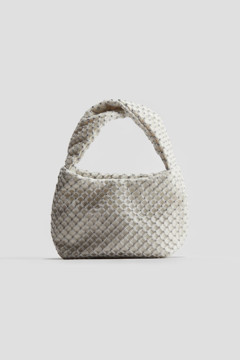 Net handbag in mesh with shimmery metallic thread. Twisted, lightly padded handle and hook-loop closure. Lined. Width 6 in. Height 4 3/4 in. Depth 2 3/4 in.